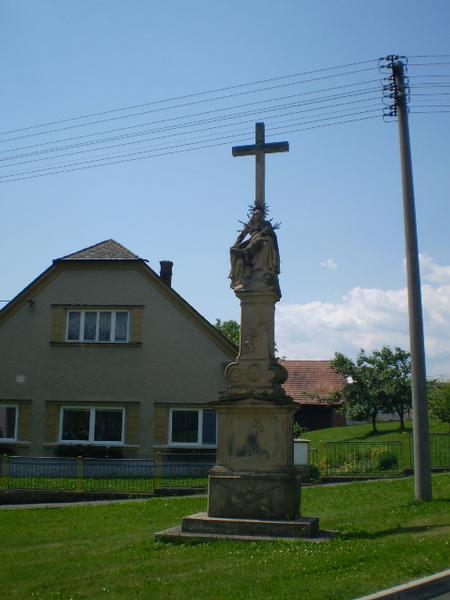Kamenný kříž se sousoším Piety je na dvojdílném podstvci. V horní části podstavce jsou reliéfy :Kristus na hoře Olivetské, sv.Jan Nepomucký a sv.Gotthard se čtyřádkovým nápisem a letopočtem. Na přední straně v dolní části podstavce je reliéf sv.Floriana. Empírové sousoší je z roku 1843, ale s novějším křížem.Dílo pochází z dílny Cyrila Kutzera