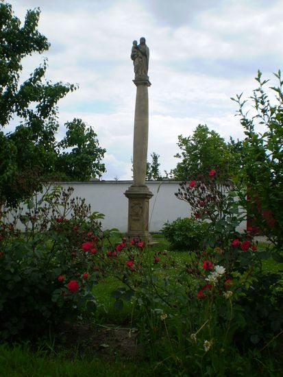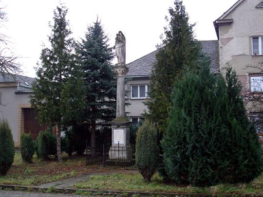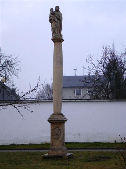Sloup se sochou Panny Marie z roku 1703 má své osudy spojené s mariánským sloupem stojícím na náměstí. Roku 1897 bylo rozhodnuto, že sloup bude odstraněn, byl v té době rozpukaný a socha měla být přemístěna do niky kartuziánské kaple na hřbitově. Následující rok zde byl postaven druhý mariánský sloup, zbožní občané však starý strhnout nenechali, a tak tu podnes stojí vedle sebe oba dva.
