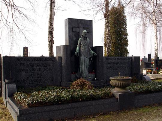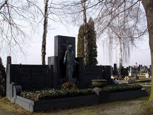 Monumentální náhrobek původních majitelů místní tvarůžkárny s bronzovou sochou Krista.