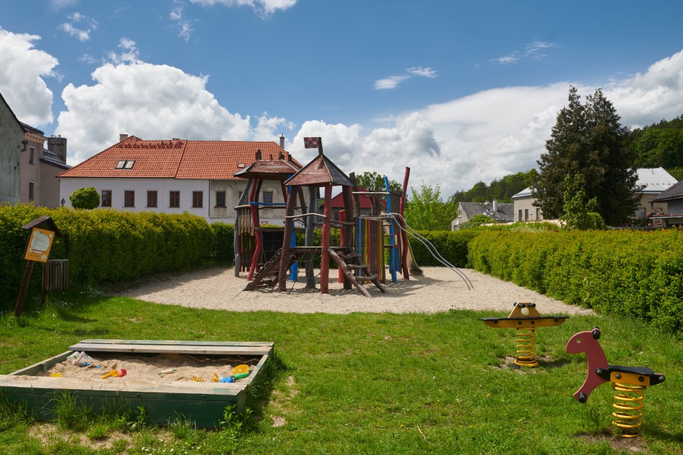 4. Klasické dětské hřiště s dřevěnými herními prvky najdete přímo na návsi. Na dohled je tu pohostinství s možností občerstvení.