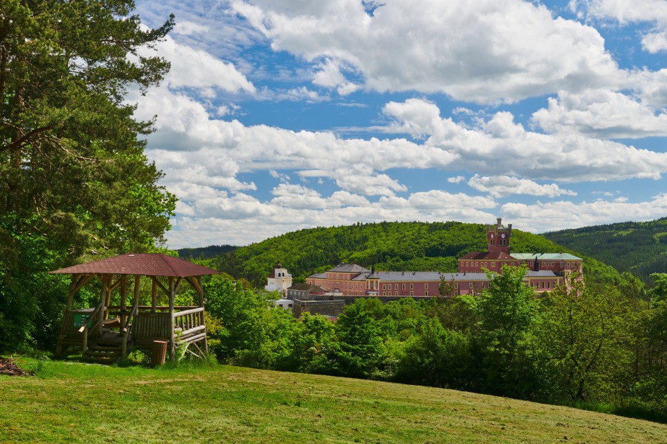2. Vyhlídka na hrad, to je dřevěný altán na louce pod lesem, strategicky umístěný tak, že z něj máte hrad jako na dlani. K vyhlídce vás navede směrovka z návsi, půjdete kolem budovy bývalé školy a kolem chatové osady.