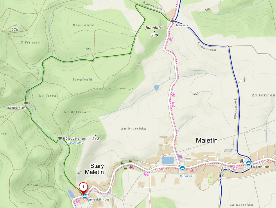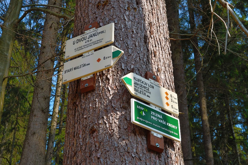 Ještě v minulém století se v Maletíně těžil pískovec a sochy z něj jsou rozesety po celé střední Evropě. Půjdete-li z obce po zelené značce, narazíte v lese na pramen U dvou Janů, kde je do pískovcové skály vytesán trpaslík. Zdejší pramen má kvalitu kojenecké vody. Na tomto kouzelném místě navíc najdete krásné lesní hřiště se stádem dřevěných jelenů, průlezkami, bludištěm a altánem. Když půjdete dál po zelené, dojdete k zatopenému Kubíčkovu lomu a k naučnému posezení. Dozvíte se tu o četných nálezech zkamenělin v maletínském pískovci. Pak můžete pokračovat dál, až dojdete na lesní křižovatku. Ač byste jej tady možná nečekali, je tu odpočinkové místo s posezením, mapou a herními prvky. Odtud pokračujte po modré turistické značce, po tzv. Švédské cestě, která vás zavede zpět do Maletína.