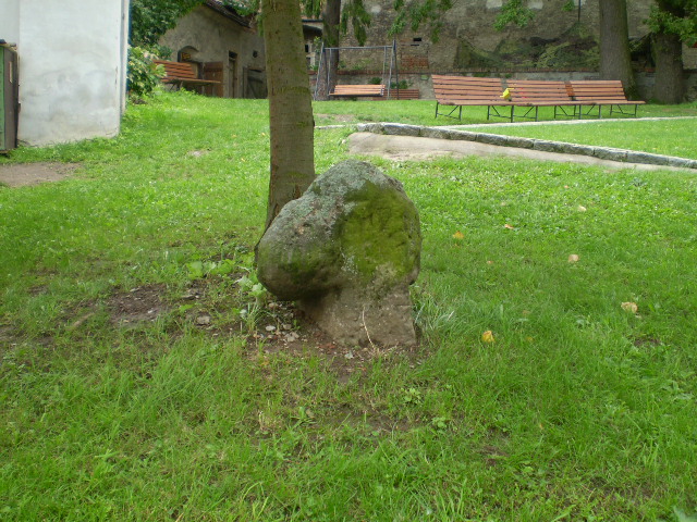 Původně stával kříž pod Kamenným kopcem a později poblíž umělé jeskyně hory Olivetské po straně místního kostela. Nyní se nachází na nádvoří zámku bez spodní části, která se nezachovala a stejně tak, jako další dva kříže, o nichž jsou zprávy pouze z ústního podání.