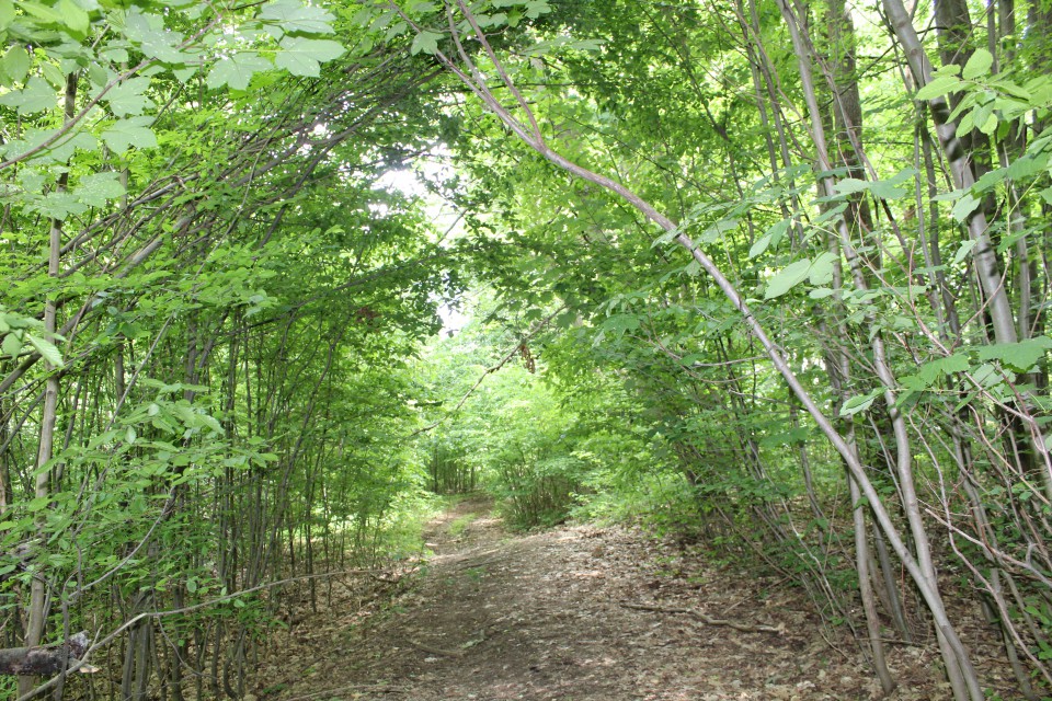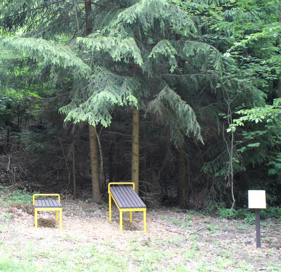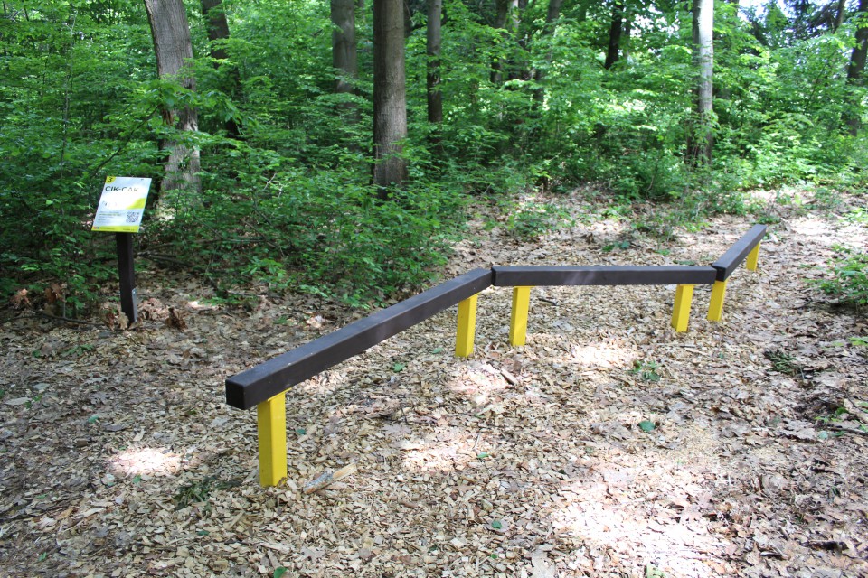 Přírodní terén, cvičební prvky ve stínu lesa.