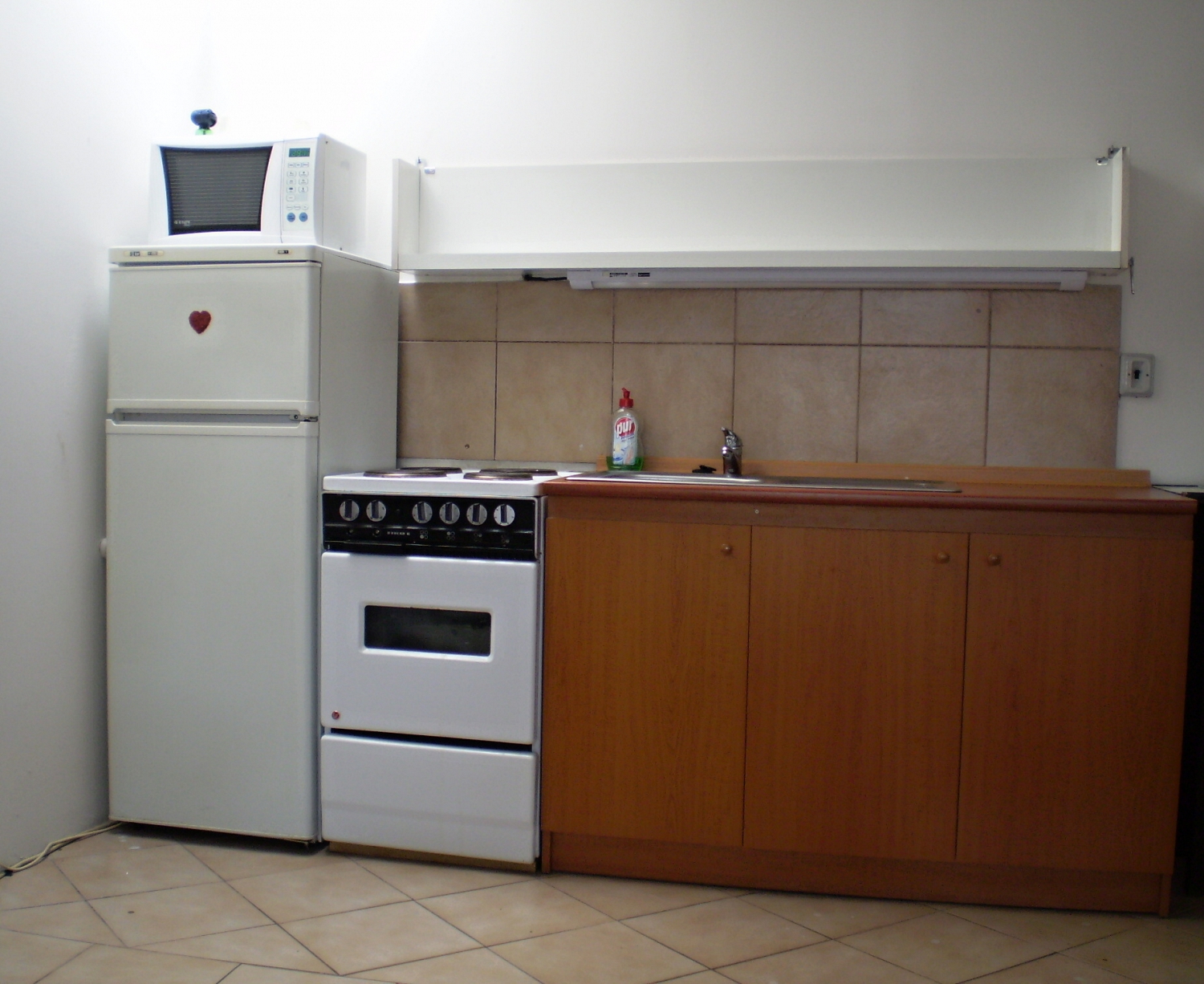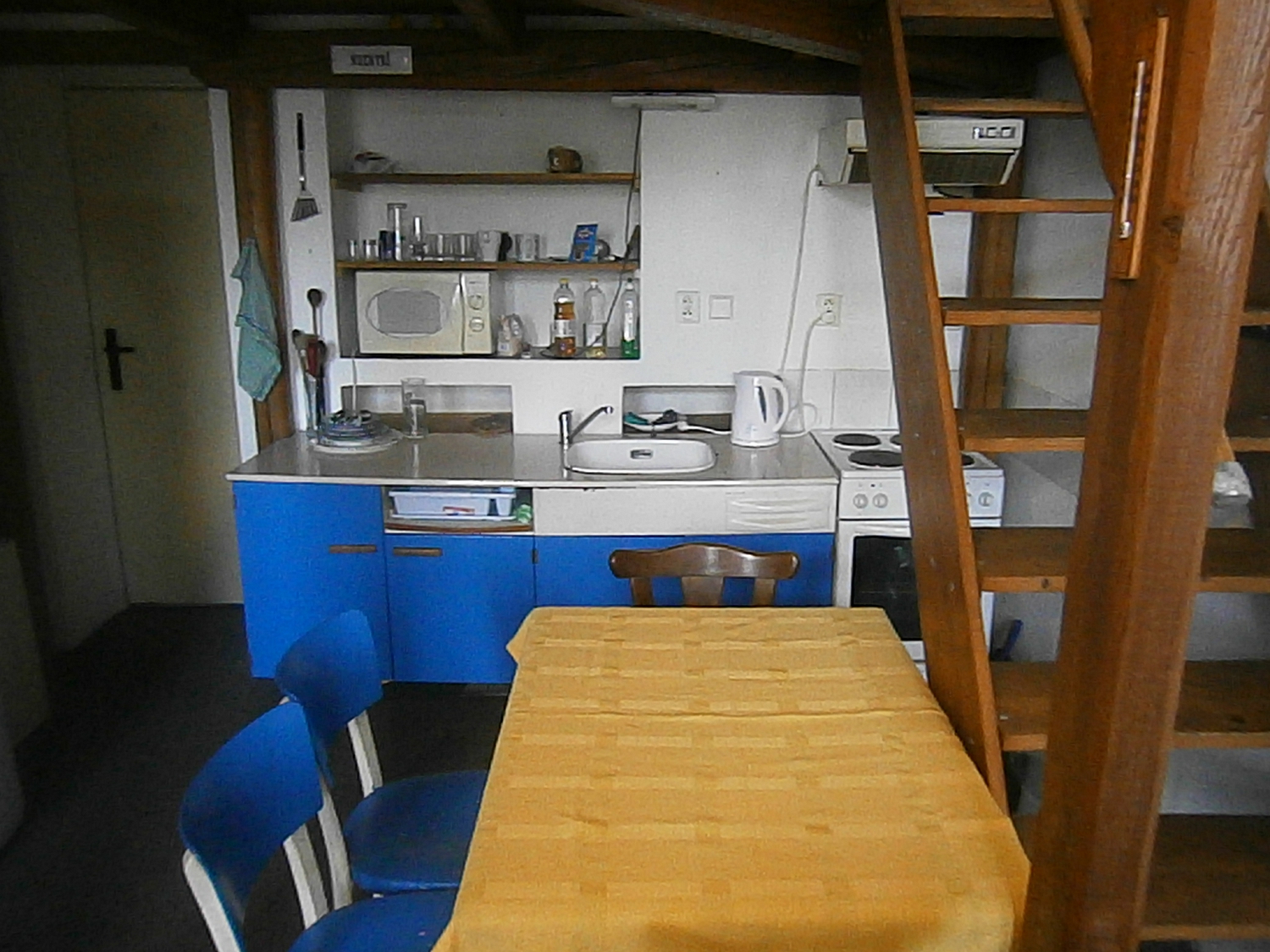Zařízení je nestandartní a velmi zajímavě řešené mimoúrovňovým umístěním ložnice. Toto řešení umožnilo získat prostor pro kuchyni a jídelní stůl. Za kuchyní je koupelna se sprchovým koutem, WC a pračkou. Nedílnou součástí je TV a připojení na internet.